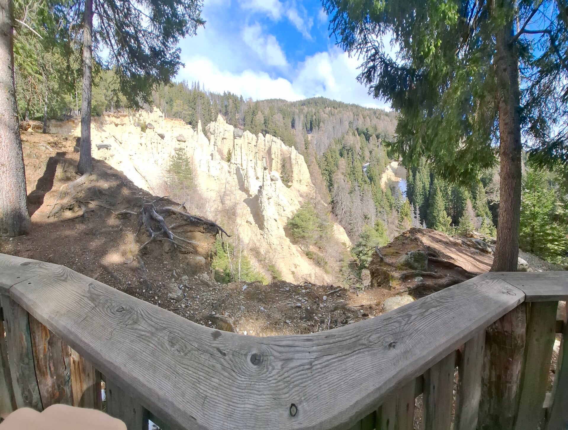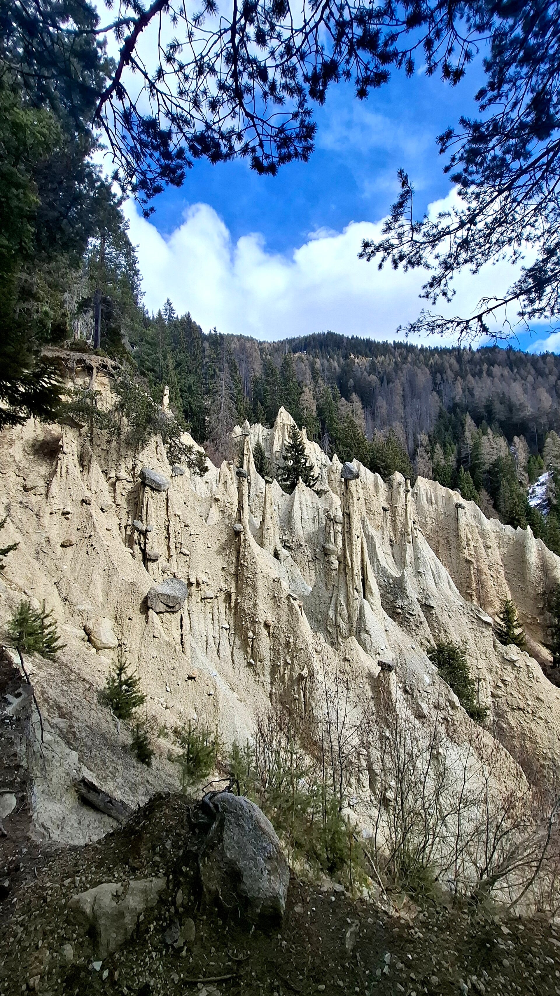Oben angekommen wartet dann das Highlight: der Blick auf die außergewöhnlichen, fast schon surreal wirkenden Erdpyramiden. Diese bizarren Formationen sehen wirklich beeindruckend aus und sind definitiv ein Moment, der bei Groß und Klein in Erinnerung bleibt. Hier oben findet ihr auch einen schönen Platz, um eine kleine Pause einzulegen, durchzuatmen und die besondere Landschaft auf euch wirken zu lassen.