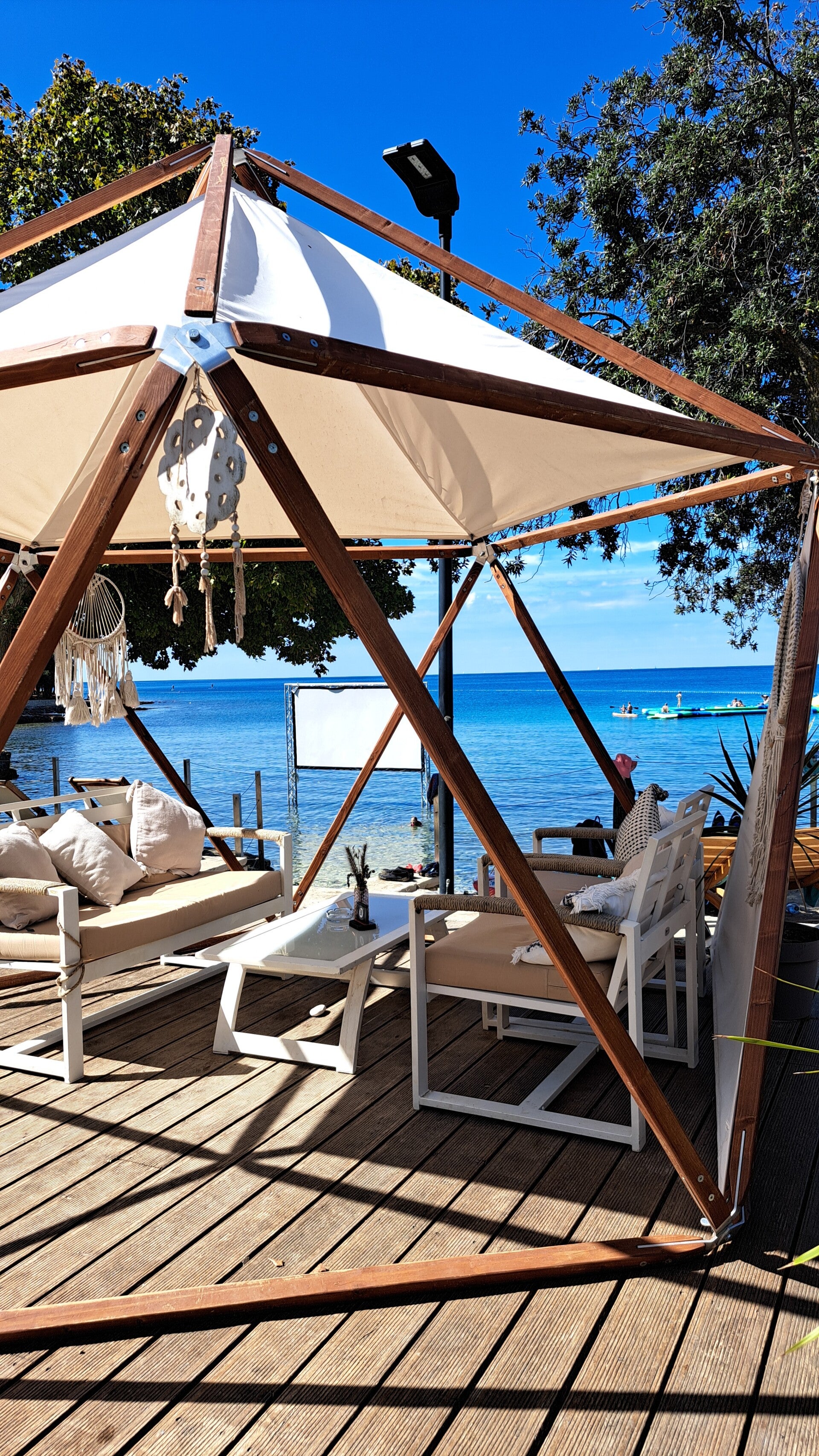 Die Bar hat völlig humane Preise und auch das ausleihen von SUP und Kajak sind völlig akzeptabel (haben für 2 Std. Kajak 20 € bezahl). Es gibt jedoch wenig Plätze zum Liegen, wir hatten jedes Mal Glück und haben einen tollen Platz unter Bäumen mit Blick auf das Meer bekommen.