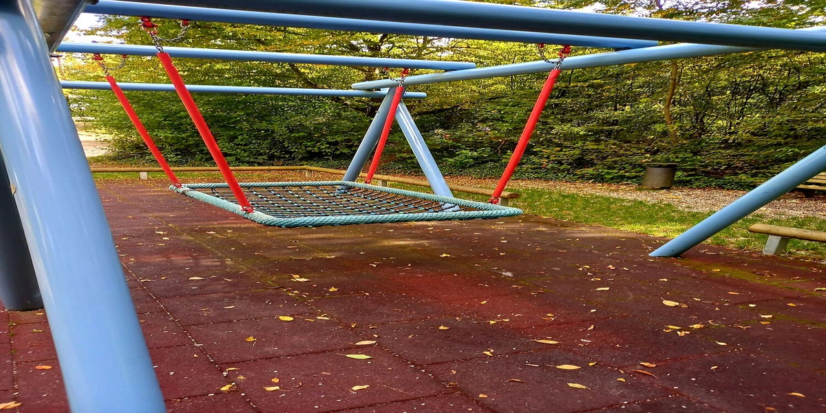 Es gibt für die größeren Kinder einen Kletterparcour, einen Rutschenturm, eine Seilbahn, mehrere normale Schaukeln und eine große Schaukel.